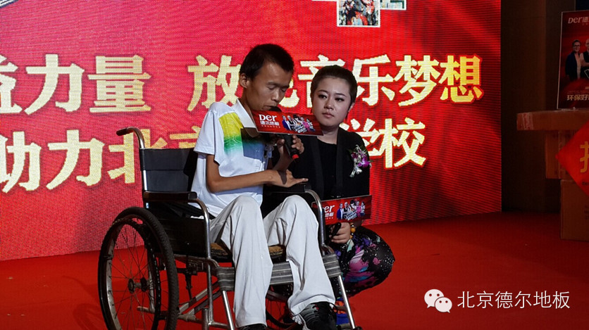 下午2点,居然之家集团副总裁孟祥明和德尔家居总经理姚红鹏分别代表居然之家和德尔地板致辞,孟祥明对现场到来的客户表示诚挚谢意,姚红鹏则讲述了德尔在公益事业上的投入以及和中国好声音的渊源。北京光爱学校石清华校长讲述了自己帮助贫困儿童所做的努力让人潸然泪下,中国好声音第一季人气学员,人称“小刘欢”的刘悦为公益活动献唱,并通过和光爱学校的“轮椅哥”于德水合唱一曲《祝福》表达了对在场爱心人士的感谢之情。会场还进行了德尔地板和居然之家共同捐助光爱学校音乐教室的捐赠仪式,在场数百名爱心人士为光爱学校现场捐款,其中一位爱心人士捐赠金额达到两万元,引起全场热烈掌声。