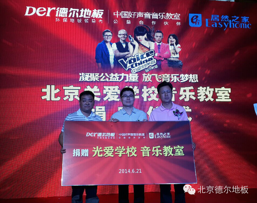 据了解,在企业发展的过程中,德尔从未忘记过回馈消费者,回馈社会,积极关注并参与到各类公益事业中去。从东南亚海啸、汶川地震的捐款,到在北大清华等高校成立奖学金和助学金,再到2012年携手中华环保基金会发起“星·众环保宣传计划”,德尔地板一向以爱心公益为己任。这次积极参与中国好声音音乐教室的建设,将是德尔于公益事业上的再一次延伸。